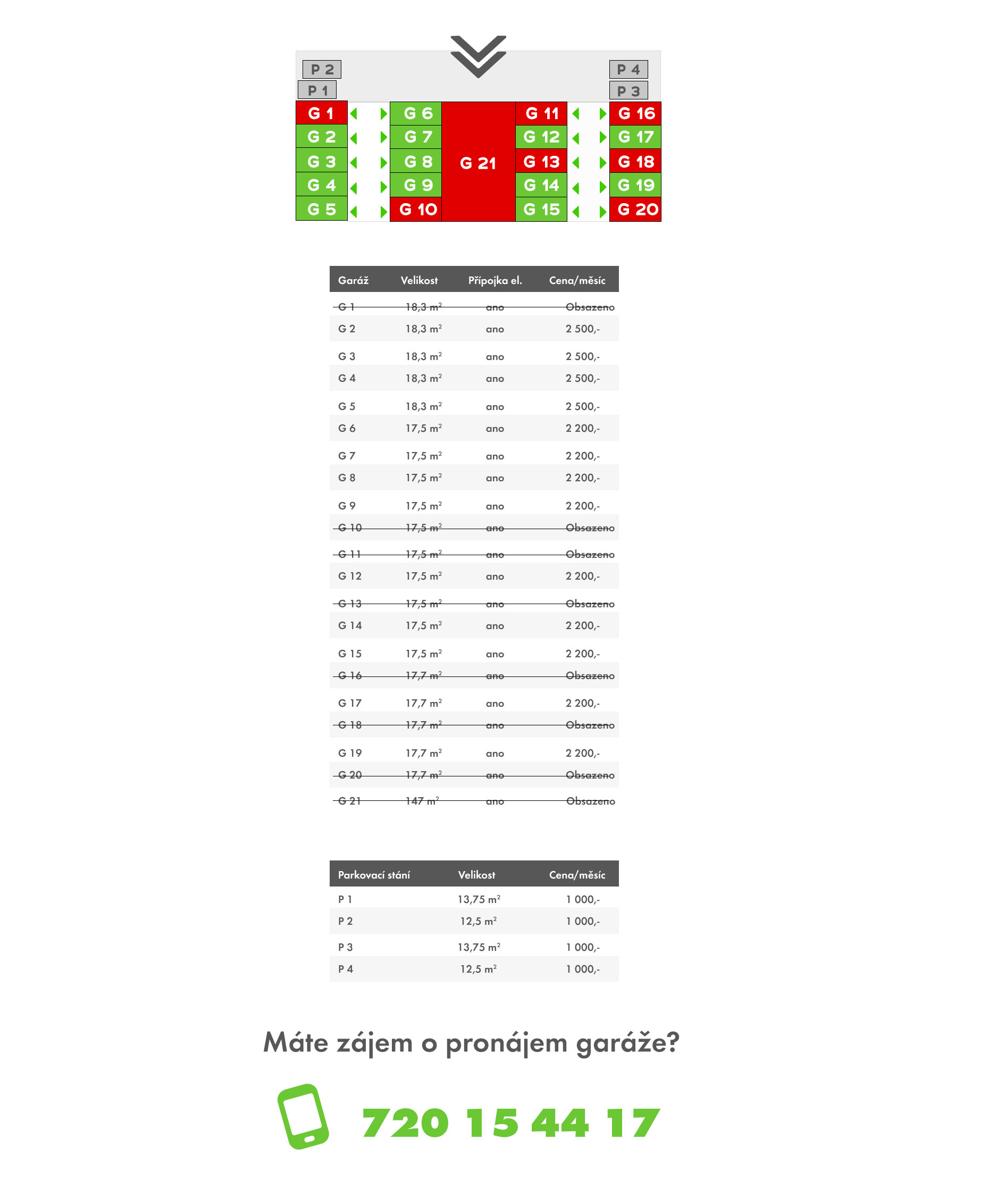 Celkem k dispozici 20 garáží s velikostí 17,5 - 18,3 m2 a s přípojkami elektrické energie.